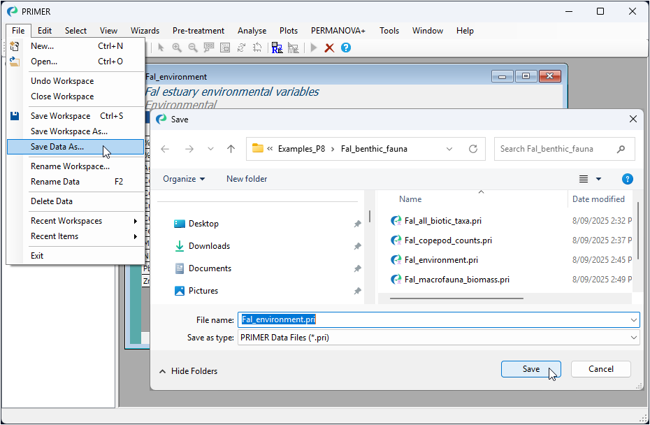 Type the name you wish to give the workspace file (e.g., Fal_environment.pwk), and click Save. This will save the entire PRIMER workspace (not just the data sheet), including all elements you may have created during the PRIMER session (e.g., data, graphics, analyses, etc.), all of which you are able to navigate and see listed (in hierarchical fashion) within the Explorer tree window on the left-hand side of the open PRIMER workspace.