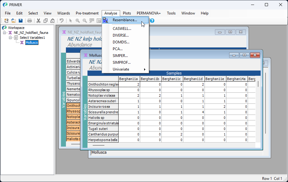 From the 'Molluscs' data sheet, click Analyse > Resemblance....