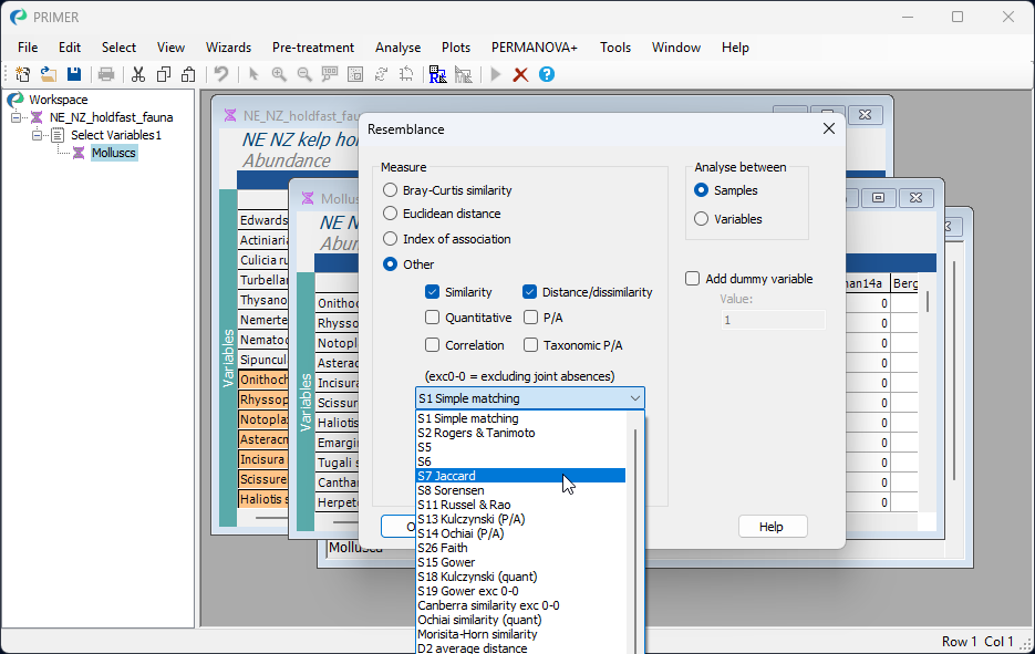 In the 'Resemblance' dialog, choose ($\bullet$Other) and then click on the drop-down menu to find 'S7 Jaccard', then click OK. (Note: 'S7' refers to the nomenclature used by Legendre & Legendre (2012) in their Chapter 7 on measures of ecological resemblance).
