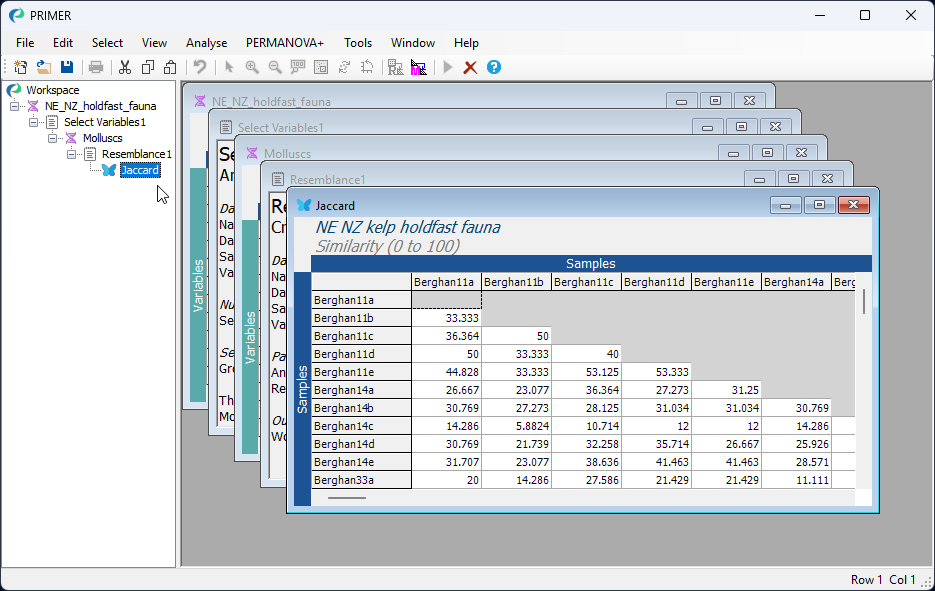 This produces a Jaccard similarity matrix among all pairs of holdfasts, called 'Resem1' by default. A nice feature of the Jaccard similarity measure is that it is directly interpretable as the percentage of shared species. For example, the first two holdfasts in the data matrix have a Jaccard similarity of 33.33%, so approximately one-third of the species that occur in either one or the other holdfast occur in both of them (i.e., are jointly present).