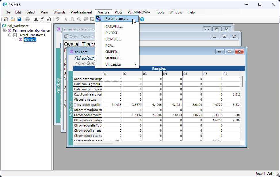 - With the data sheet named '4th-root' from the previous step as the active window, click on Analyse > Resemblance...