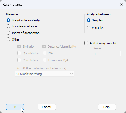 - In the 'Resemblance' dialog, under 'Measure', click on $\bullet$Bray-Curtis similarity (the default), then click OK.