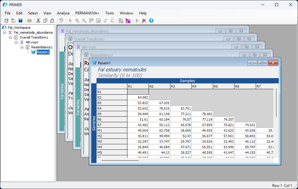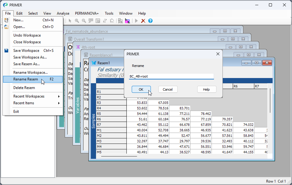 - It is (once again) good practice to re-name the sheet containing the resulting resemblance matrix (currently called 'Resem1') something that would be more useful for future reference. Click on the 'Resem1' sheet, then click on File > Rename Resem and call it 'BC_4th-root' for clarity in ensuing analyses.