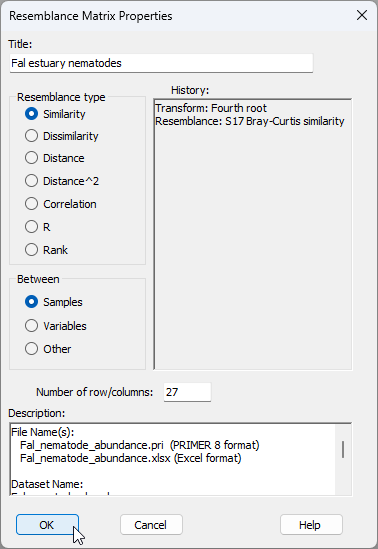 Notice that this will inherit relevant properties and also factors that were associated with the dataset from which it was generated. From the 'Resem1' matrix as the active window, click on Edit > Properties to see the properties associated with this resemblance matrix (shown below); you can also click on Edit > Factors to see the factors (which have not changed).