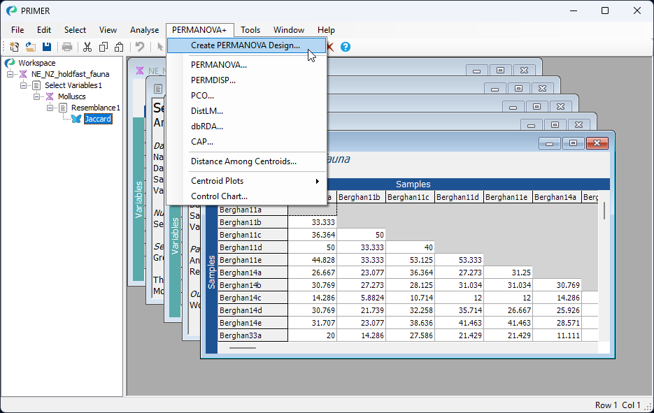 - From the resemblance matrix ('Jaccard'), click PERMANOVA+ > Create PERMANOVA Design....
