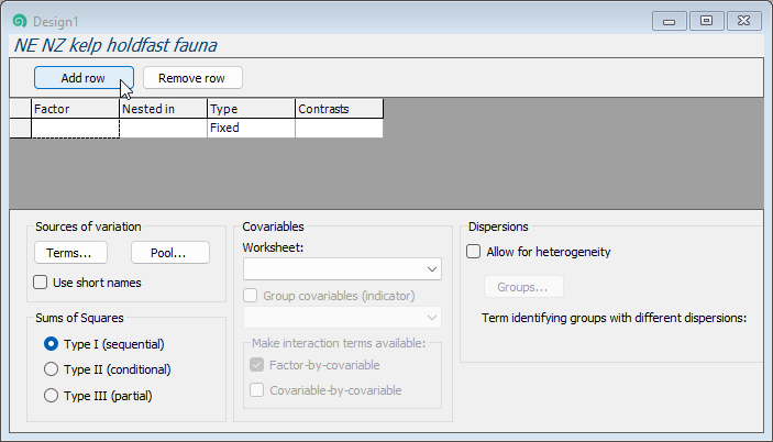 , which you can use to specify all pertinent aspects of the sampling / experimental design‡. Initially, it will only be shown with a single row. There need to be as many rows as there are factors in your design. So, here, we will add two more rows by clicking on the 'Add row' button twice: