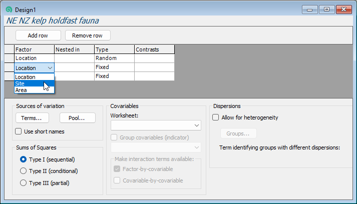 - Area: Finally, we need to specify the third factor (Areas) correctly in row 3 of the design file. Under 'Factor' choose 'Area'. Under 'Nested in', specify 'Site', and make sure that column three has the word 'Random'. The final three-way nested design file should look like this: