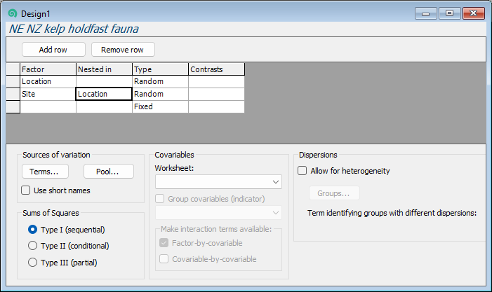 You can see the Factors associated with the holdfast data matrix (or its resemblance matrix) by clicking on Edit > Factors.... These factors will be 'visible' to the PERMANOVA dialog that we will use to create our design file.