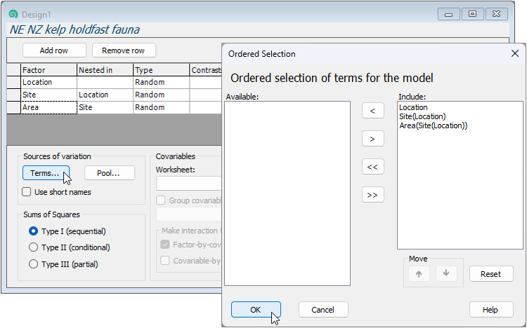- Sites are nested in Locations, so we have to specify that in column two ('Nested in'), accordingly. Double-click on the cell in row 2 in column 2 and a 'Selection' dialog will pop up to allow you to choose the factors within which 'Site' is nested. You will need to click on the word 'Location' (in the 'Available:' box on the left), then on the single-right-arrow button (