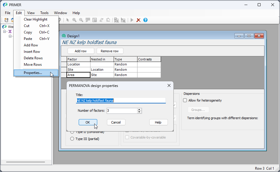 ‡ Note that a Design-file item in PRIMER 8 has its own properties, which you can see by clicking on Edit > Properties. Doing this shows a title for the design (which can be modified if desired) and you can also specify the number of factors (rows) in this way (rather than using the 'Add row' and 'Remove row' buttons):