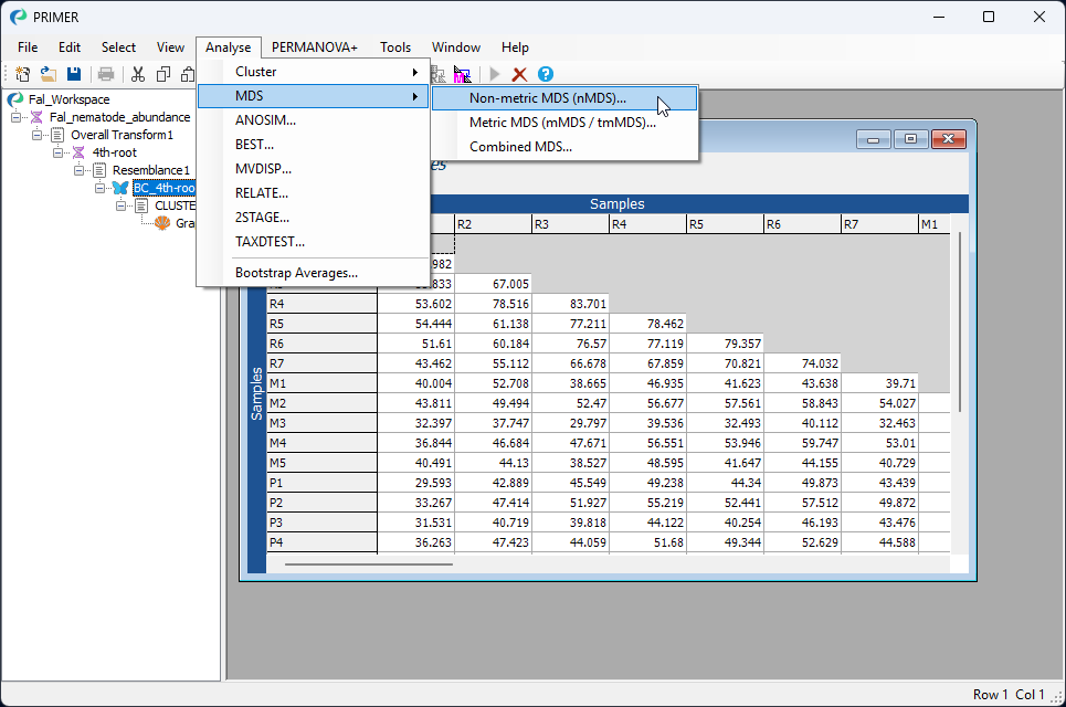 From the Bray-Curtis resemblance matrix ('BC_4th-root' in this example), click Analyse > MDS > Non-metric MDS..., then click OK to run the MDS algorithm with all of the default options.