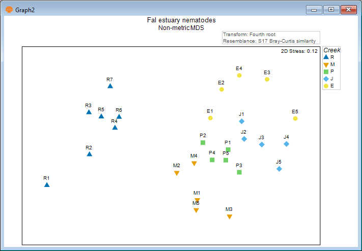 It is clear from this output that Restronguet Creek ('R') has assemblages of nematodes that are quite dissimilar from those found in the other four creeks. That's consistent with what we saw in the cluster analysis of these data. We can, however, get quite a few more insights from the nMDS plot than were apparent in the cluster dendrogram. For example, relationships among the assemblages from the other four creeks seem to be ordered (from the bottom-left towards the top of the plot) as follows: Percuil → St. Just → Pill → Mylor. It is also apparent that the samples from Pill Creek ('P') form a tighter cluster hence are not as variable as the samples from (say) Restronguet Creek ('R'), which are more spread out. Being able to see potential gradients of change in assemblages, the degree of between-group differences, as well as the relative sizes of within-group dispersions, is all very useful.
