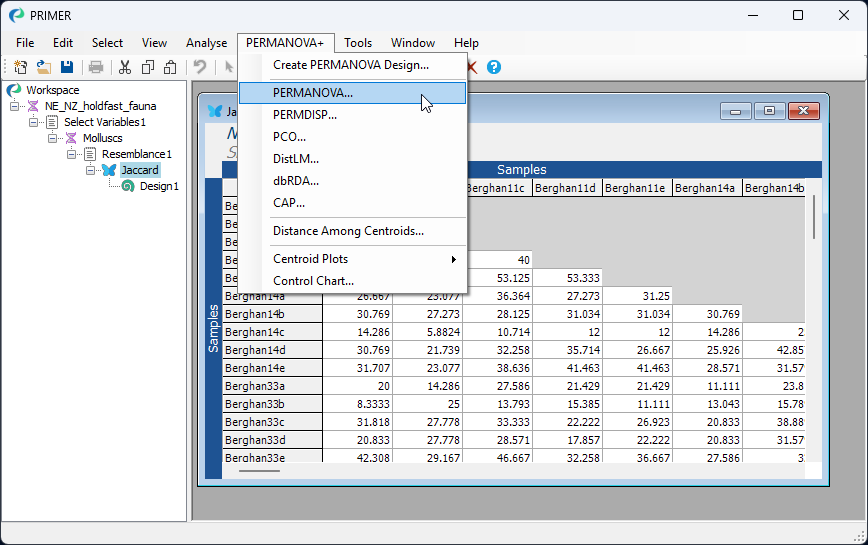 - Click on the 'Jaccard' resemblance matrix in the Explorer tree so that it is the active item in the workspace, then click PERMANOVA+ > PERMANOVA...