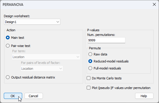 - Check to see that the 'Design worksheet:' is Design1; this is the design file we created in the previous step that contains the three-way nested design. For the rest, we will keep the defaults in the PERMANOVA dialog, as shown below, then click OK.