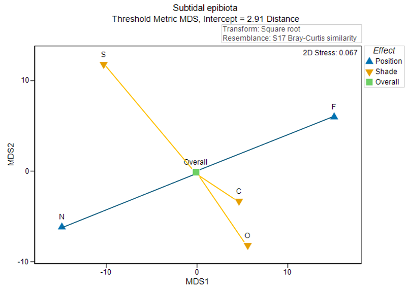 As there are (typically) far fewer points in an ordination plot of distances among centroids, we tend to be able to get an interpretable diagram with tolerably low stress (< 0.2) using metric or threshold metric MDS; we typically do not need to use a (more forgiving) non-metric MDS to visualise these relationships. This is clearly advantageous, as our resulting ordination plot will therefore have labels on its axes, hence the relative sizes of effects (in the units of the original chosen resemblance measure) can be visualised, quantified and compared with one another. In the present example, the effects of 'Position' (correlated somewhat with the first tmMDS axis) are somewhat larger in size than the effects of 'Shade' (correlated somewhat with the second tmMDS axis).