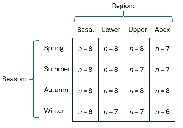 Importantly, we can also see patterns that signal the potential reasons for detection of a significant two-way interaction here; the seasonal patterns do appear to differ for different regions of the estuary. For example, the shift from Autumn to Winter is much larger for Apex and Upper regions, compared to that observed for the Lower and Basal regions. Pair-wise comparisons confirm this observed pattern in the plot; specifically, the pair-wise test of Autumn vs Winter is not statistically significant for either the Basal or the Lower region ($P$ > 0.25 in both cases), but the shift is strongly significant for the Upper and Apex regions ($P$ < 0.001 in both cases).