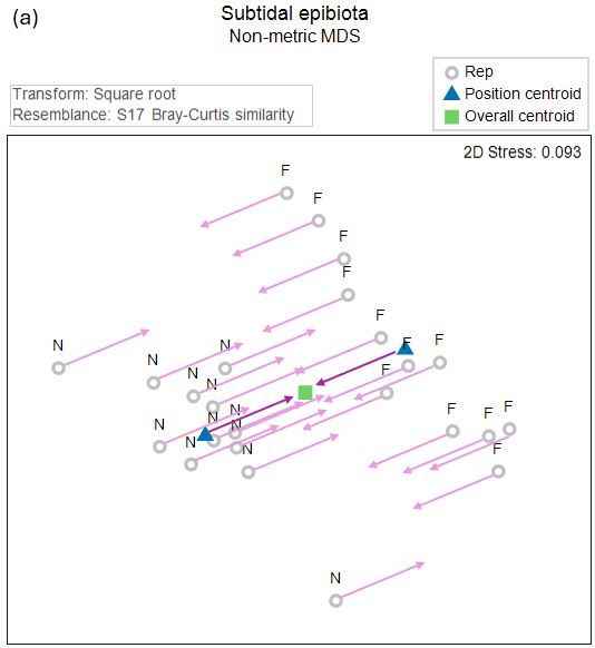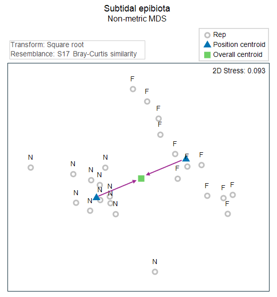 In essence, the removal of a factor is equivalent, conceptually, to superimposing the group centroids onto a common (overall) centroid. For example, let's re-visit the 2-factor crossed study design by Glasby (1999) . In this study, the cover of subtidal epifauna was quantified on subtidal settlement plates in response to two crossed factors: Position ('N' = near the seafloor, 'F' = far from the seafloor) and Shade ('S' = shaded, 'C' = procedural control, 'O' = open).