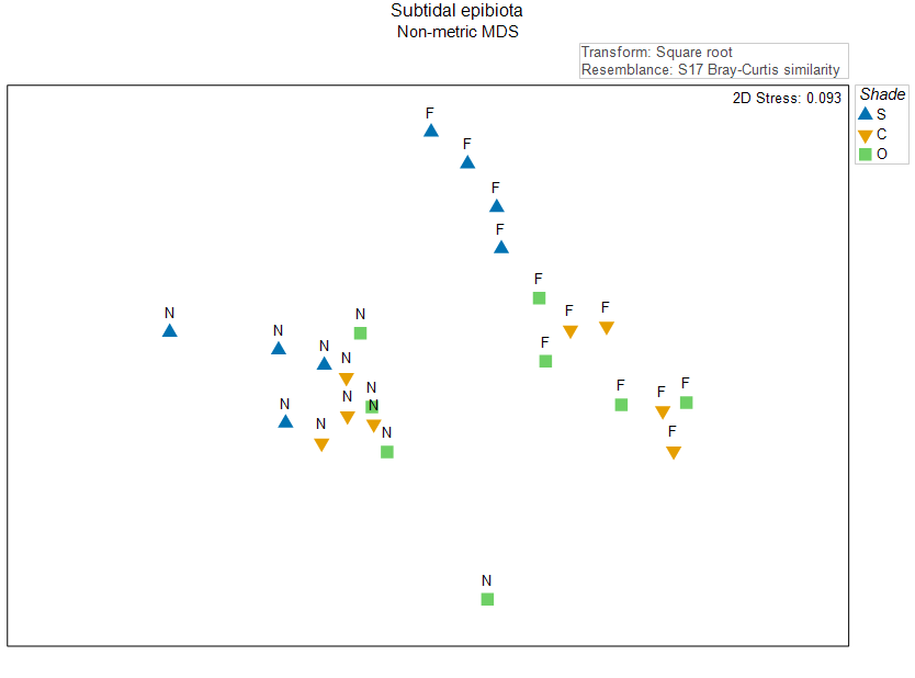 This plot shows (with a tolerable level of stress) the inter-sample relationships among multivariate residuals, after removing 'Position' effects in the high-dimensional Bray-Curtis space. The effects of shading on these subtidal epibiotic assemblages are very clearly seen now, indeed.