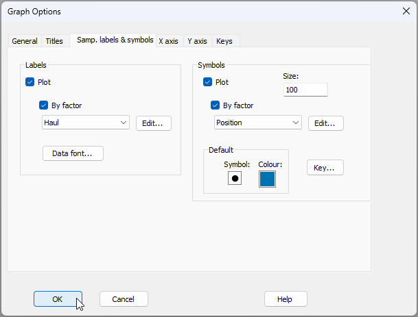 - When you get the multi-plot output, you will see that 'Graph1' in the Explorer tree has the lowest-stress 2D nMDS plot achieved by the routine. From 'Graph1', click Graph > Sample Labels & Symbols... and choose the Labels to be plotted according to the factor of 'Haul', and the Symbols to be plotted according to the factor of 'Position', like so: