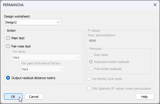 - Fit a PERMANOVA model with one factor only: 'Haul', and choose the option to output a residual distance matrix.