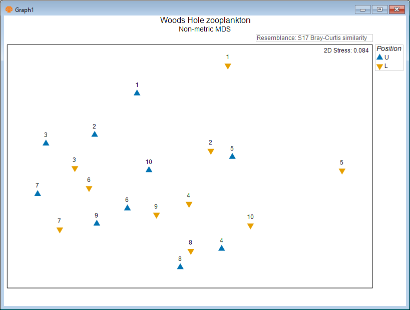 In the above ordination, there do not appear to be any obvious effects on these plankton communities attributable to the factor of 'Position'. Specifically, the symbols corresponding to assemblages caught in Upper ('U') vs Lower ('L') nets are scattered throughout the plot and look to be well mixed throughout this 2D MDS space. If anything, individual 'Hauls' seem to be more important in explaining variation here; we can see assemblages associatd with specific hauls (i.e., the two matching numbers, such as the two 7's, the two 3's, the two 8's, etc.) are often fairly close to one another in this nMDS plot.