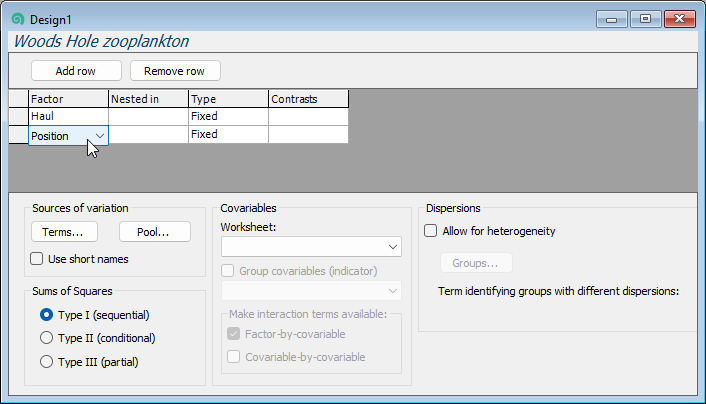 - Create a design file in accordance with the desired two-factor PERMANOVA model. From 'Resem1', click PERMANOVA+ > Create PERMANOVA Design.... In the resulting design file, called 'Design1', add a row (so there are 2 rows in total), then click inside the appropriate cells in the first column to choose the two factors: 'Haul' and 'Position' in rows 1 and 2, respectively. Also specify the factor of 'Haul' as 'Random' (under 'Type' in column 3), while 'Position' will remain as 'Fixed'. The resulting design file should look like this: