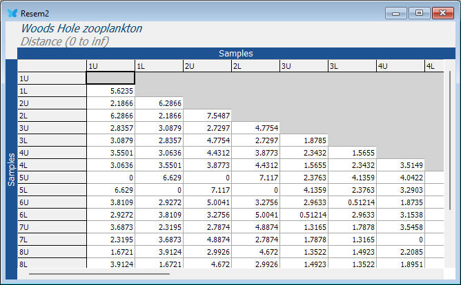 - From the 'Woods_Hole_zooplankton' data sheet, calculate a Bray-Curtis resemblance matrix by clicking Analyse > Resemblance and taking all the defaults (click 'OK'). The result will be 'Resem1', as shown below: