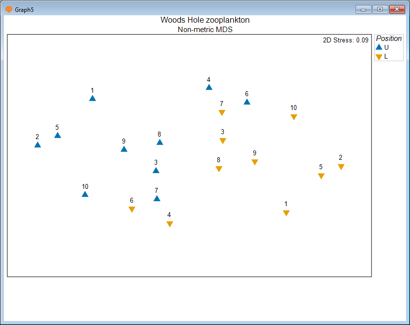 - Finally, we are ready to take a look at our multivariate residuals in an ordination diagram. From 'Resem2', click Analyse > MDS > Nonmetric MDS (nMDS).... Accept all of the defaults in the 'Non Metric MDS' dialog and just click 'OK'. Once the default plot has been produced, click Graph > Sample Labels & Symbols... and choose the Labels to be plotted according to the factor of 'Haul', and the Symbols to be plotted according to the factor of 'Position', just as we had done before.