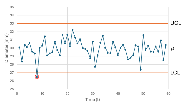 Fig. 12.1 Univariate control chart for the hypothetical example, plotting the measured diameter of spools of thread vs time, with $\mu$ = 30 (green horizontal line) and $\sigma$ = 1. Upper and lower control chart bounds (UCL and LCL, respectively) are shown as orange horizontal lines. Samples that fall beyond the control-chart limits (circled in red) are deemd to be 'out of control'.