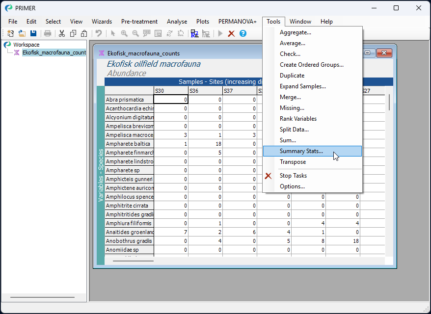 From the 'Ekofisk_macrofauna_counts' data sheet inside PRIMER, click on Tools > Summary Stats..., as shown below: