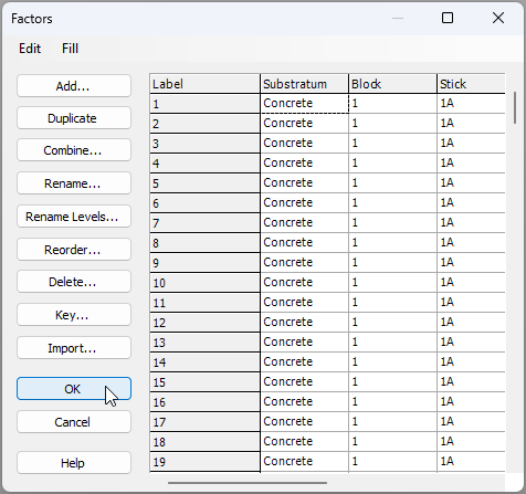 1. It would be useful to see the empirical distributions for the four different surfaces side by side on a single plot. From the data sheet, click Edit > Factors.. and you can see the factor of 'Substratum' that shows the type of surface on which each individual measured oyster had settled.