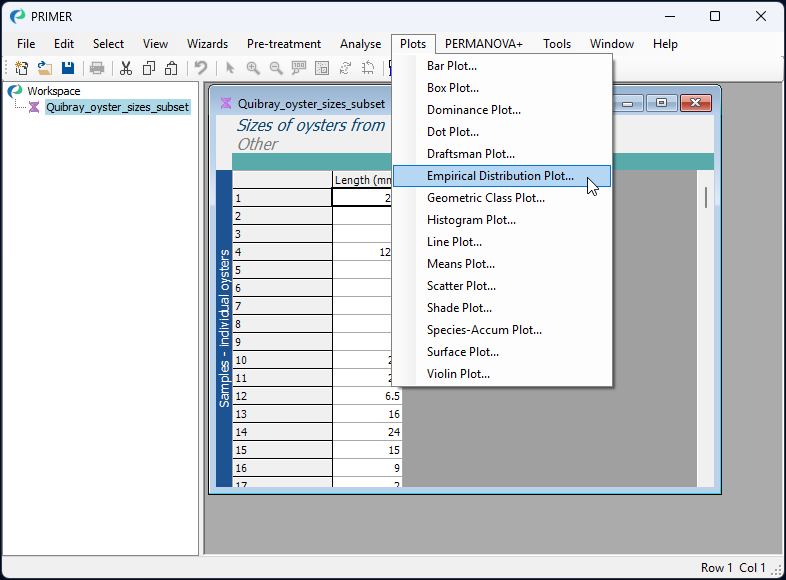1. Start running PRIMER 8, then click File > Open... and open the data file named 'Quibray_oyster_sizes_subset.pri' (in 'Examples_P8 > Quibray_oysters').