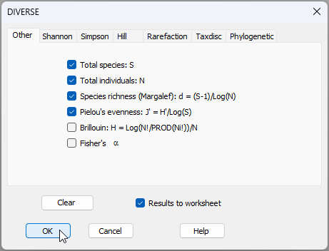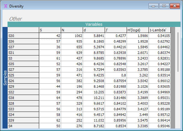 You can (optionally) re-name the resulting data sheet of diversity metrics (called 'Data1') by clicking on that sheet, then click File > Rename Data and type a new name 'Diversity', then click 'OK'. The suite of univariate diversity metrics, calculated on each sampling unit, are now evident in this renamed data sheet, as follows: