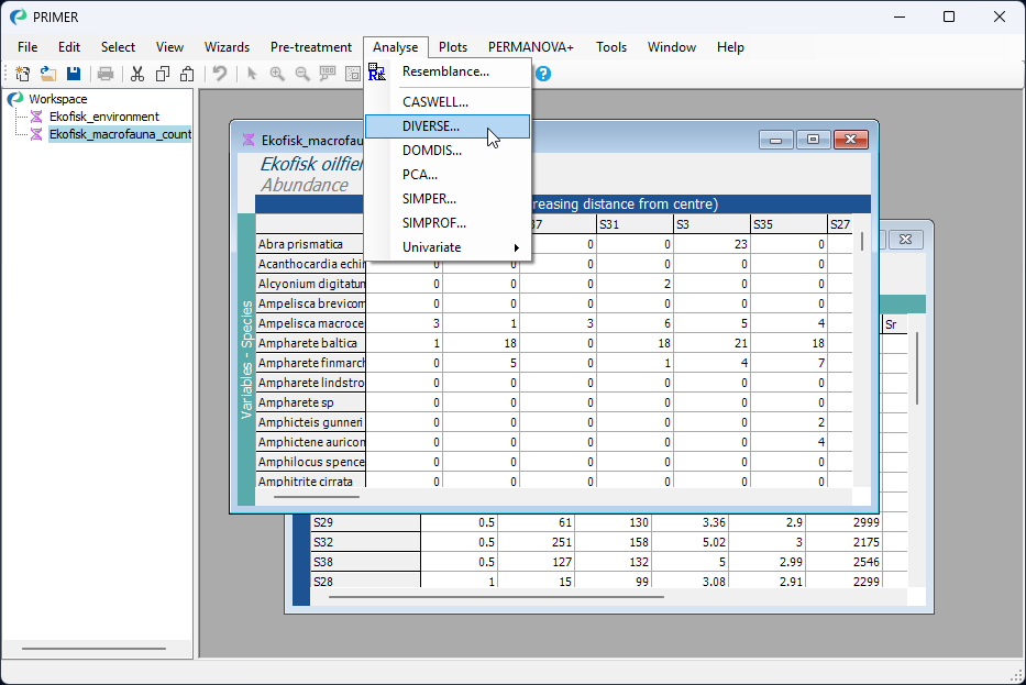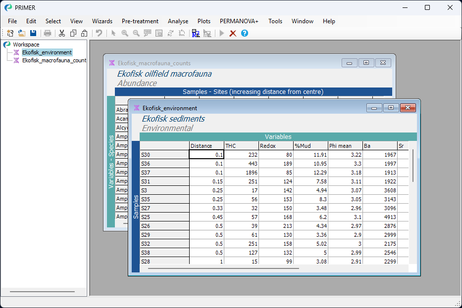 To demonstrate the test of association, we shall re-visit a dataset of macrofauna assemblages collected from sites near an oilfield in the North Sea. In this study by Gray et al. (1990) , macrofauna were sampled from 39 sites in an approximately 5-spoke radial design, at increasing distances from undersea drilling activities at the Ekofisk oilfield. There were three day-grab samples taken from each site; information from these were combined to yield abundance values for each of $p$ = 173 soft-sediment macrofaunal taxa at every site. The macrofauna data are given in the file 'Ekofisk_macrofauna_counts.pri', found in the 'Examples_P8 > Ekofisk_macrofauna' folder. Environmental variables were also obtained at each site, and these, along with the actual distance from the oilfield centre, are given in the file 'Ekofisk_environment.pri'. Open up both of these files in PRIMER, as shown below: