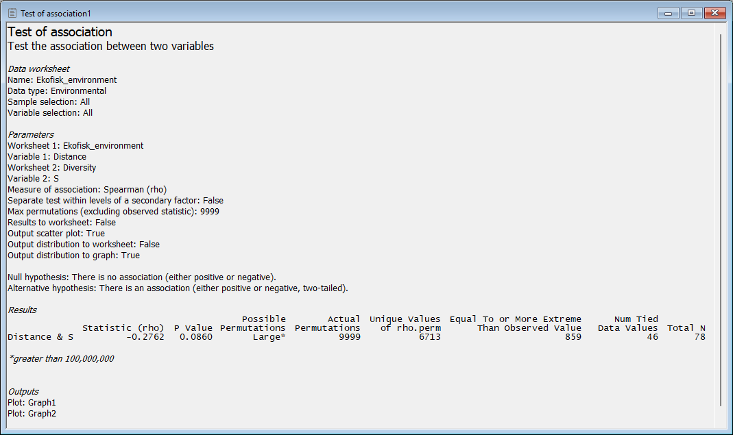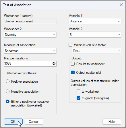 Now, let's run the test of association. We wish to test the null hypothesis of 'no association' between species richness (the variable called 'S' in the 'Diversity' data sheet) and distance from the oil platform's drilling activity (the variable called 'Distance' in the 'Ekofisk_environment' data sheet). From the 'Ekofisk_environment' data sheet, click Analyse > Univariate > Association....
