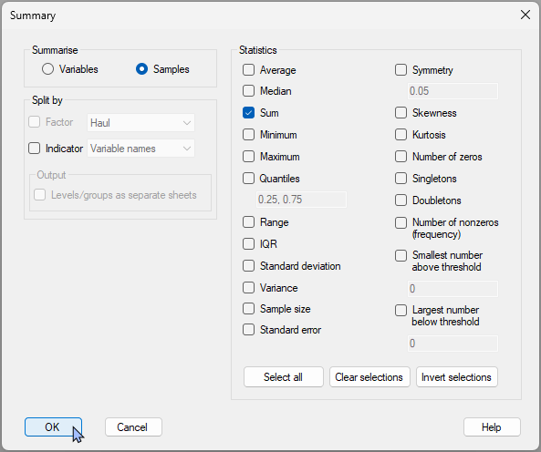 - Click Tools > Summary Stats… then (Summarise $\bullet$Samples) & (Statistics $\checkmark$Sum), and click ‘OK’. {Note: Be sure to untick the default tickbox, ($\square$ Average), as here we only want to get the sum across the five variables in order to analyse the sum of log abundances across the 5 variables for each sample, as a univariate variable}.