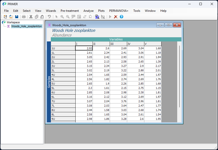 - Open up the file (‘Woods_Hole_zooplankton.pri’) in PRIMER and note that the abundances are already expressed as log abundance values, so there is no need to apply any transformation.