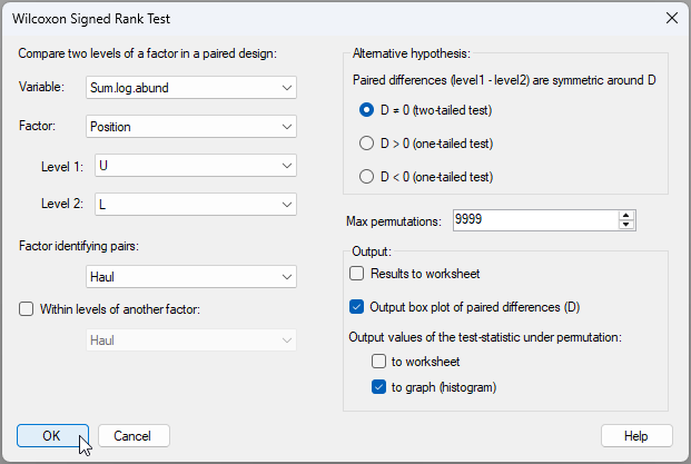 Clearly, the two nets (upper and lower) being hauled at the same time are ‘paired’ with one another, so the ‘Haul’ factor is the factor identifying the different pairs of samples here. These data are located in the file ‘Woods_Hole_zooplankton.pri’, found inside the 'Examples_P8 > Woods_Hole_zooplankton' folder. Here, we are going to analyse a single variable – the sum of the log abundances of all plankton types. Specifically, we are going to test the null hypothesis that the paired differences between the upper and lower nets are stochastically symmetric about zero (i.e., there is no effect of ‘Position’).