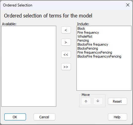 First, you will notice that there is a dash ('-') in the 'Nested in' column for the factor of 'WholePlot'. This is because whole-plots, having been identified as such, are deemed effectively to contribute an 'error' into the study design, which means they are necessarily nested within all of the broad-scale factors (in the present case, the broad-scale factors are 'Block' and 'Fire frequency'). Having specified that 'WholePlots' are of Type 'Subject/Whole-plot error', it is not necessary to also articulate this nested structure as well. The dash ('-') merely indicates this column has been 'taken care of' internally, so-to-speak, for the whole-plot factor.