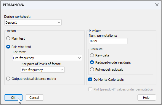 - To run pairwise tests, start from the original resemblance matrix ('Resem1') and click PERMANOVA+ > PERMANOVA.... Ensuring, once again, that the design worksheet is 'Design1', under 'Action', choose: ($\bullet$Pair-wise test > (For term: Fire frequency > (For pairs of levels of factor: Fire frequency) ) ). You might also (optionally) tick the option to '$\checkmark$Do Monte Carlo tests', simply because there are not very many whole plots to permute at the large spatial scale. Leaving everything else as the defaults, click 'OK', viz: