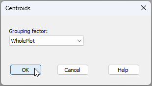 - From the original resemblance matrix ('Resem1'), we can calculate distances among whole-plot centroids by clicking PERMANOVA+ > Distance Among Centroids..., and choosing the 'Grouping factor' as 'WholePlot', as shown below: