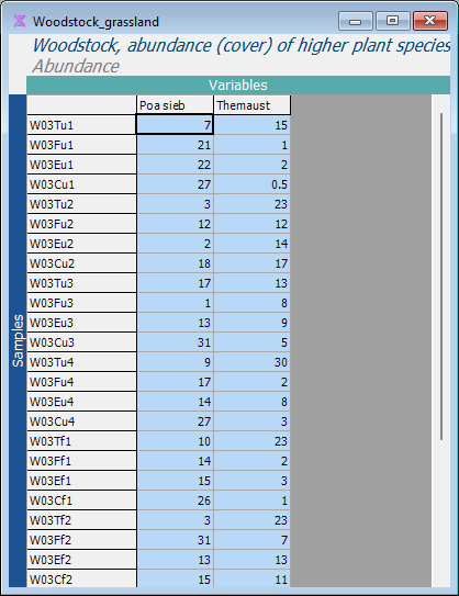 We want to select all variables except the two dominant grasses. We will first find these two variables in the data file, highlight them and then invert that highlighting in order to select the remaining species. The two dominant grasses Poa sieberiana and Themeda australis are named 'Poa sieb' and 'Themaus' in the data file, respectively.