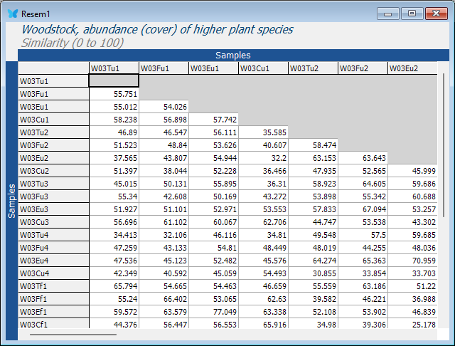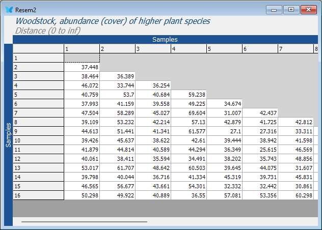 This will produce a new resemblance matrix of Bray-Curtis resemblances among the centroids for the 16 whole-plots, caled 'Resem2':